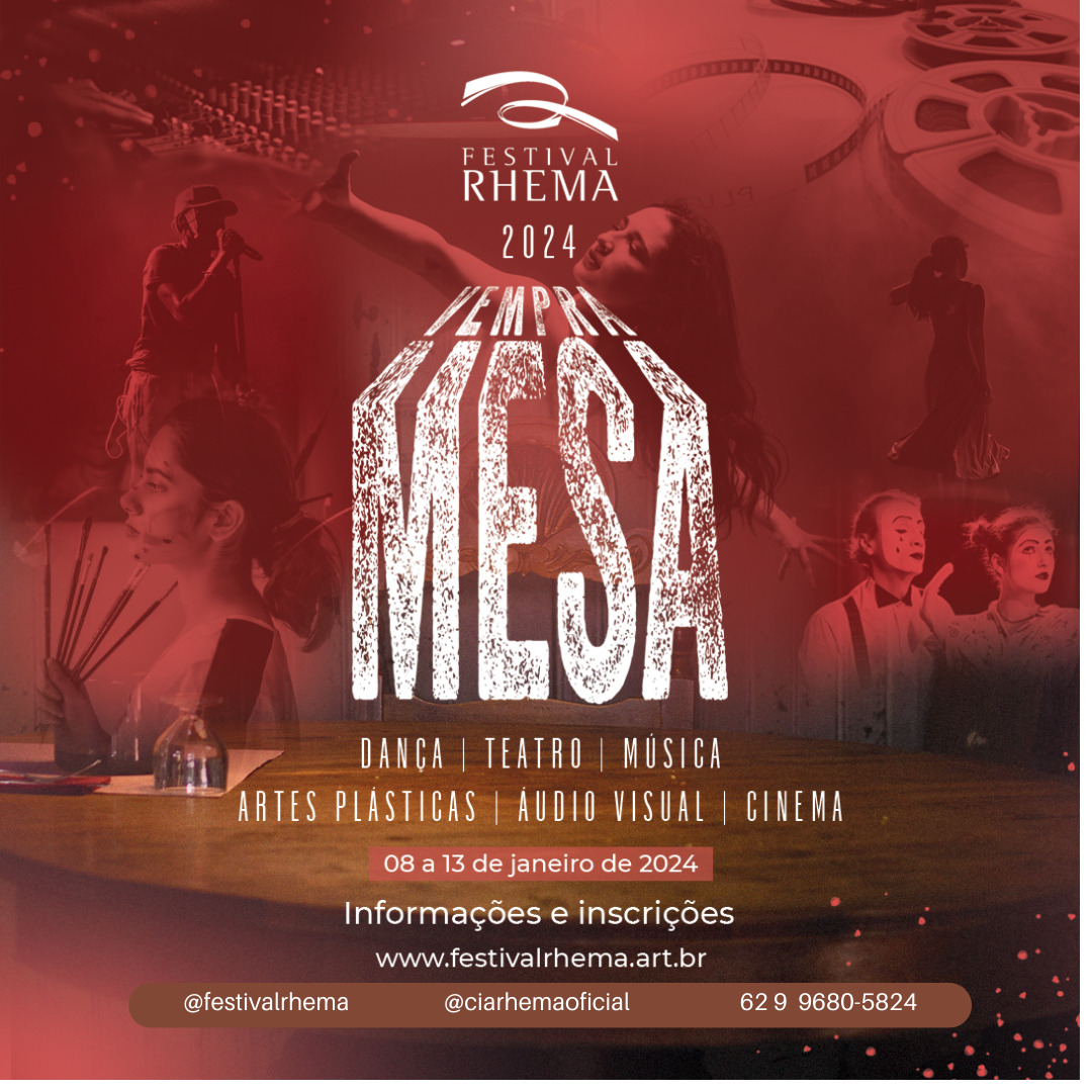 Com o tema “Vem pra Mesa”, o Festival Rhema 2024 acontece de 8 a 13 de janeiro, no auditório da Igreja Luz para os Povos, no Parque Amazônia, em Goiânia. Centenas de bailarinos, atores e artistas de diversos segmentos se reúnem para aprimorar talentos através das mais de 40 oficinas, que vão desde montagem de coreografia, jazz, moderno, danças urbanas, circo, teatro, roteiro teatral, cinema, artes plásticas, preparação física para bailarinos, dentre outros.
