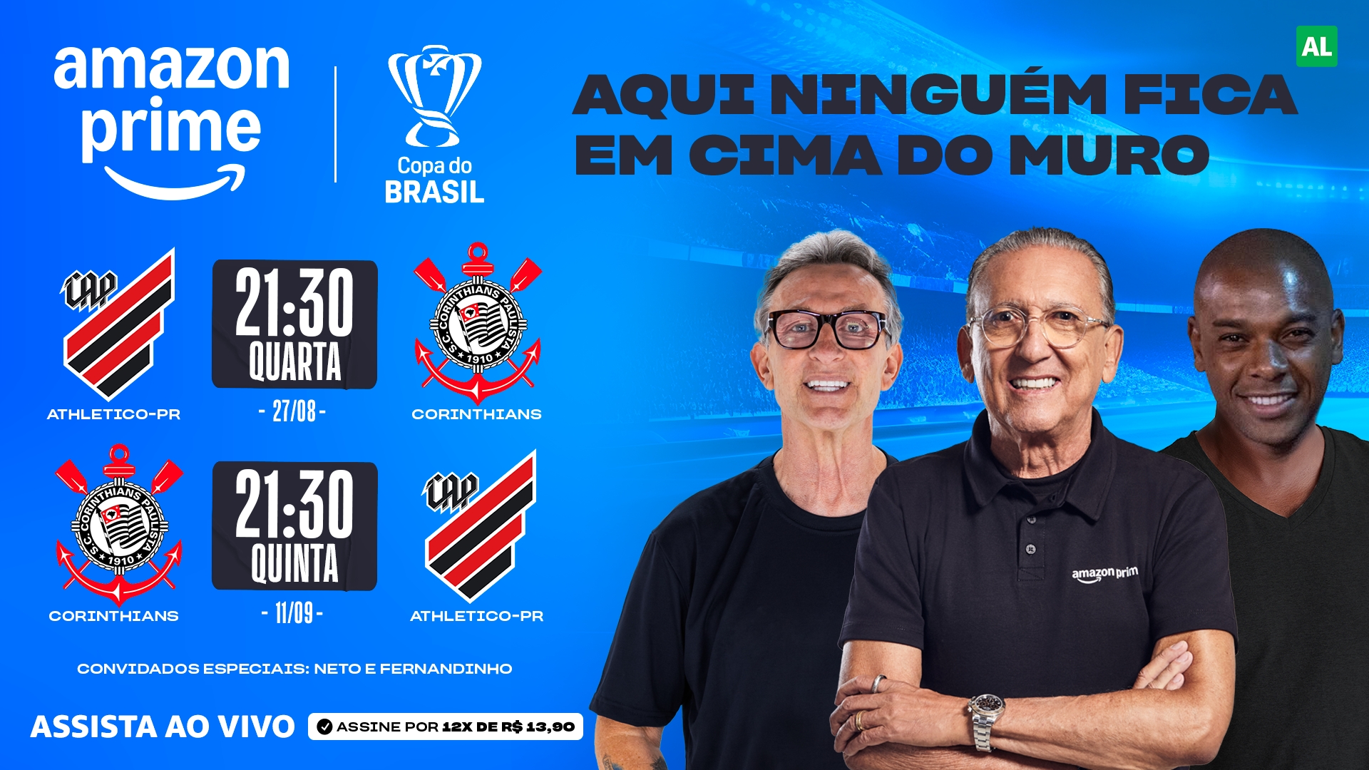 27/8/2025 – 21h30: Athletico-PR x Corinthians – Galvão Bueno, Fernandinho, Neto, Nadine Basttos e Mauro Naves