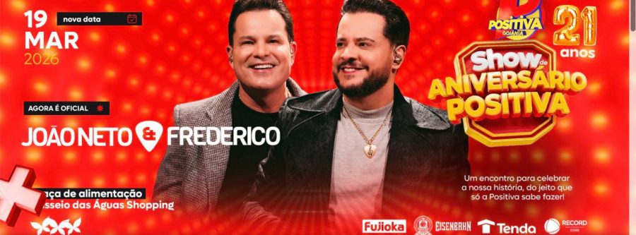A Positiva FM 99.1 comemora seus 21 anos de história com uma grande celebração ao lado dos ouvintes. No próximo dia 19 de março, quinta-feira, a rádio promove um show especial com a dupla João Neto & Frederico, na Praça de Alimentação do Passeio das Águas Shopping, em Goiânia.