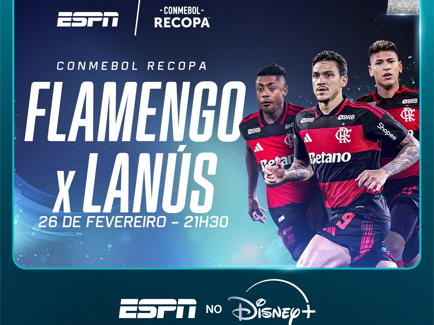 A ESPN e o Disney+ Premium exibirão com exclusividade o duelo entre Flamengo e Lanús, da Argentina, pela decisão da Recopa. Para acompanhar a partida, a emissora preparou uma ampla.